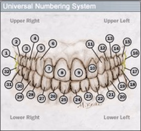 Numbering permanent teeth range from #1 to #32. #1 starts with a patient’s upper right molar/wisdom tooth going to #16 on the patient’s upper left molar. Then, starting at the #17 on the patient’s lower left molar to #32 of the patient’s lower right molar. Sometimes, patients may be missing a significant number of teeth and it may be easier to document teeth by their type and location (i.e. upper left incisor, right lower premolar etc.).